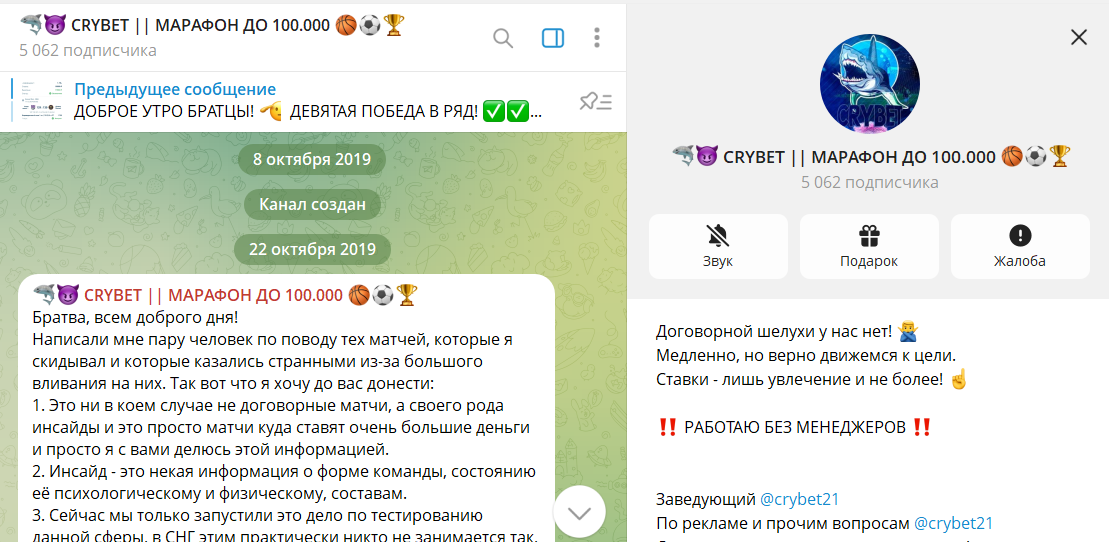 CRYBET | Марафон до 100000 – это проект в телеграмме со ставками на баскетбол и футбол. Роль прогнозиста исполняет Никита (crybet21), каппер ведет личную статистику, но верифицированных данных нет. При анализе мошеннические услуги не выявлены, но важно понимать, по платникам легко скрыть минусы. Причем в сети бывшие клиенты оставляют плохие отзывы (есть и хорошие отклики).