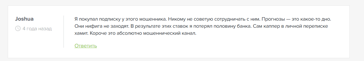 В телеграмме каппер Никита (@crybet21) демонстрирует постоянно переписки с покупателями экспрессов. Клиенты остаются довольны и условиями, и проходимостью ставок на спорт. Команда KAPER.PRO изучила информацию о портале на тематических сервисах. Обзорные публикации написаны с невысоким рейтингом, а вот мнение посетителей сторонних сайтов разделились. Кто-то хвалит прогнозиста, но есть и те, кто называет аналитика мошенником: