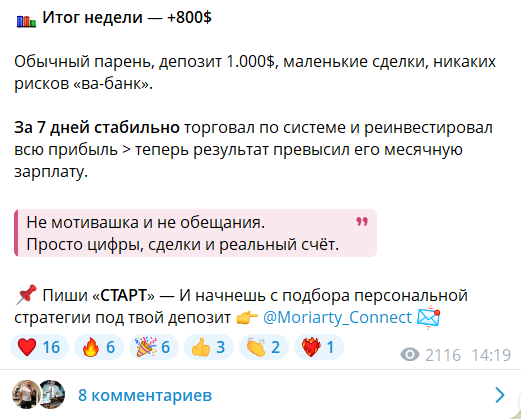 На канале Крипто Мориарти ежедневно выходят посты, мол, смотрите, сколько людей со мной получают доход, а ты все сидишь, пиши «Старт» и начнем:
