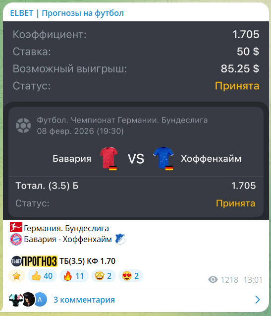 Бесплатный прогноз на футбол с телеграм-канала ELBET