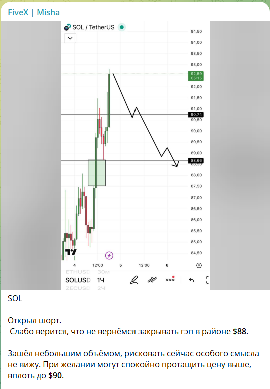 На канале TG FiveX | Misha почти каждый день выходят новые прогнозы. В посте трейдер указывает предполагаемую цену и дает небольшой комментарий: