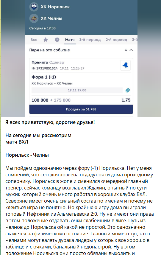 Каппер Roman Gurin при публикации совета на канале ТГ Hockey Player s Blog свое мнение сопровождает комментарием, что позволяет понять, почему заключено пари именно на этот исход в матче: