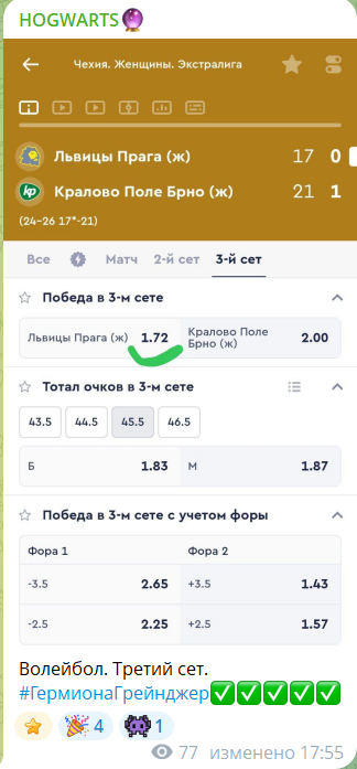 Большинство прогнозов на канале TG HOGWARTS выходят по линии Live. Ставят на победы и тоталы в матчах и сетах: