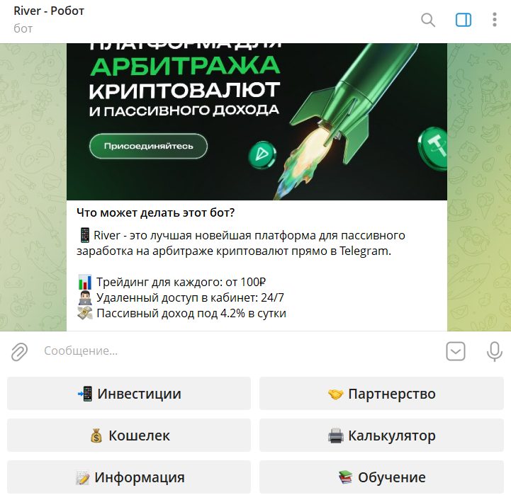 Большинство людей на инвестициях в социальных сетях теряют деньги по своей наивности и необразованности. Бот в телеграмме River — Робот рассчитан именно на такую аудиторию. Да, на молодом сомнительном проекте возможны разовые выплаты, но вывести больше, чем вложил, никогда не дадут. Отзывы в интернете пока не появились, но мошеннический ресурс только начал развиваться.