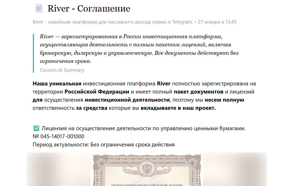 Там всем рассказывают, что компания официально зарегистрирована в Москве и даже имеет лицензию на осуществления деятельности. Во-первых, в документах указано совсем другое название. Во-вторых, лицензия дана на работу с ценными бумагами (акциями), а в описании бота сказано, что занимаются арбитражем криптовалют, которая в России считается недвижимостью. Выводы делает каждый сам…