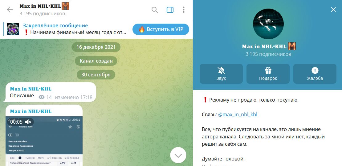 Создатель и руководитель портала Максим (@max_in_nhl_khl) предлагает своей аудитории заработок в букмекерской конторе по бесплатным и платным прогнозам. Высокий процент победных ставок автор доказывает выигрышными купонами из БК и диалогами с участниками приватного чата. Букмекеры не рекламируются.