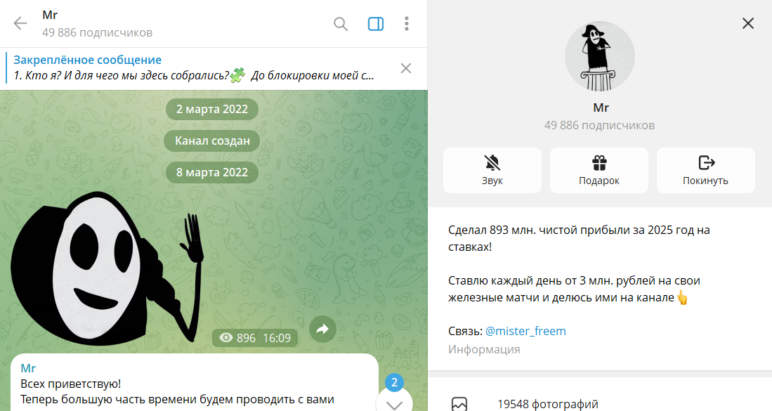 Создатель и руководитель группы Freeman (@mister_freem) о себе рассказывает, что стабильно зарабатывает на ставках в букмекерской конторе и роскошно проживает в Индонезии. Свои слова подкрепляет бесплатными прогнозами, на платной основе предусмотрены штучные советы по высокой цене.