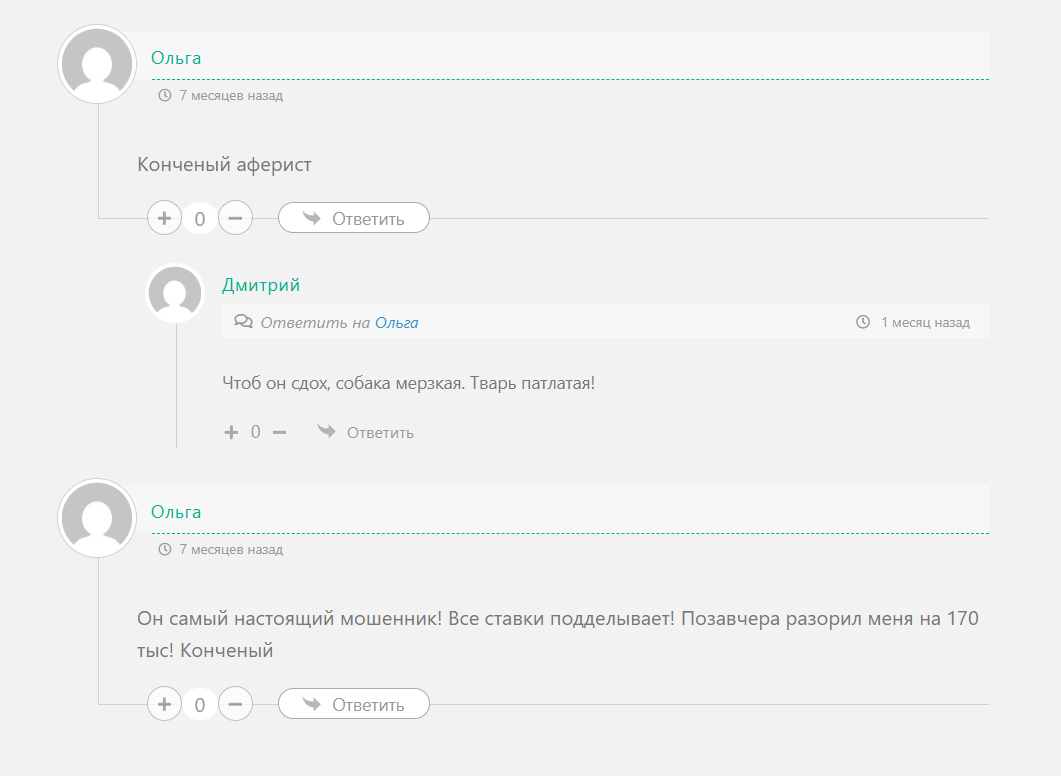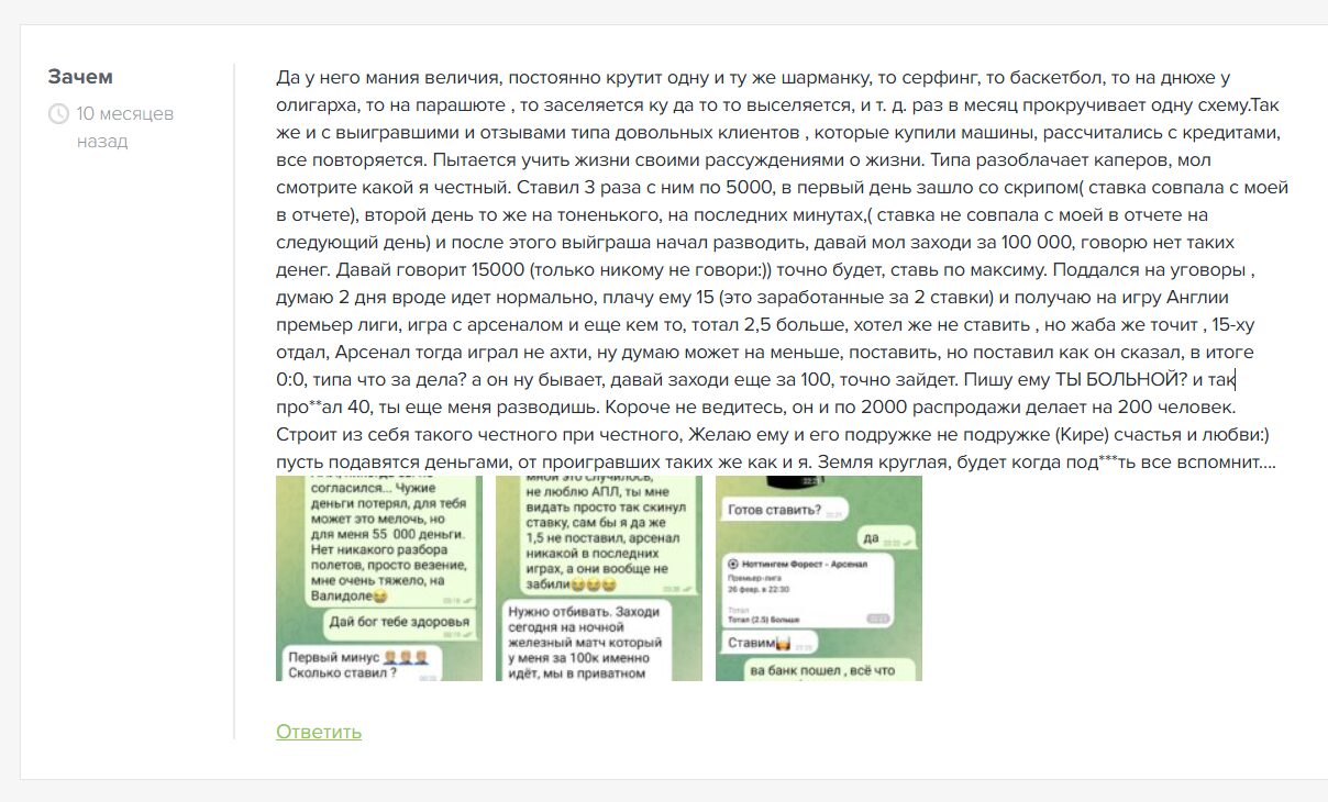 Вся лента канала в телеграме заполнена переписки с покупателями ставок. Обращать внимания на такие результаты не нужно. Наша команда проанализировала сторонние ресурсы и встретила огромное количество обзоров с обвинением в разводе, причем под публикациями практически везде оставлены жалобы от кинутых подписчиков: