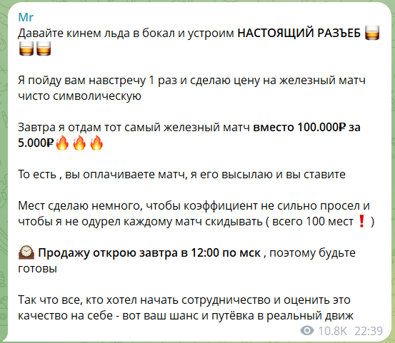 Бесплатные ставки в открытом доступе на канале TG Mr. Freeman появляются крайне редко. Основной упор сделан на продажу штучных прогнозов с коэффициентами 2.0: