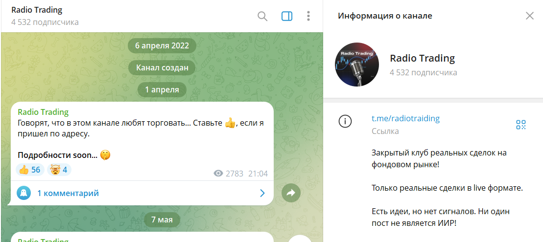 Проект Radio Trading посвящен торговле на фондовом рынке, в роли трейдера и инвестора выступает Maxim (@maxvrynke). Проверка показала, что канал в телеграмме лучше расценивать как информационный, так как конкретных сигналов здесь нет, а статистика не ведется. Настораживает и тот момент, что подписчиков постоянно завлекают в личные сообщения, причем в интернете общая негативная оценка, в жалобах люди обвиняют автора даже в мошенничестве.