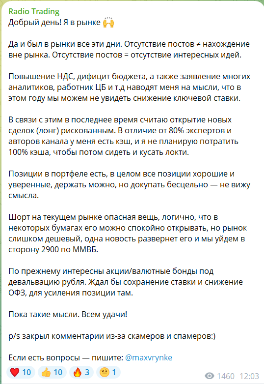 Еще раз повторимся, конкретных прогнозов нет, на канале ТГ Радио Трейдинг инвестор просто высказывает свое мнение по рынку: