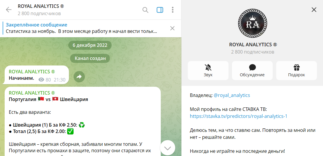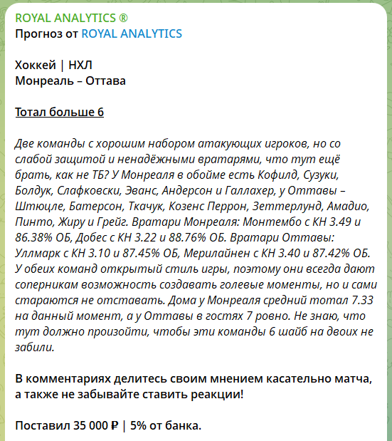 Отзывы о ставках на канале ROYAL ANALYTICS в телеграме