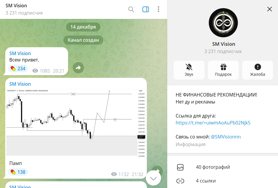 На крипто проекте SM Vision торгуют на фьючерсном рынке. Трейдер Александр (SMVisionnn) ведет собственную статистику по каждой сделки. При анализе наши эксперты не выявили мошеннические услуги, но канал в телеграмме молодой, и пока какие-либо выводы делать рано. Совет! Прежде чем торговать на реальные деньги, лучше 2-4 недели последить за результатами: проходимостью, прибылью.