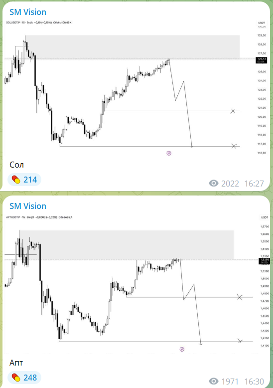 Все прогнозы на канале SM Vision в телеграме выходят без обоснования по сделанному выбору. Точки входа, цели и стопы не указываются. Трейдер Александр просто на графике показывает, куда пойдет цена по определенному активу: