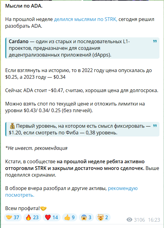 Ресурс основан 26 августа 2017, первая публикация в ленте появилась 30 января 2018. На канале 16.9 тыс. подписчиков, за сутки на пост примерно по 3 тыс. просмотров, что говорит о высокой активности. В качестве достоинства выделяются открытые комментарии, а минус заключается в отсутствии сообщений. С участниками делятся обзорами и мнением по определенным крипто активам: