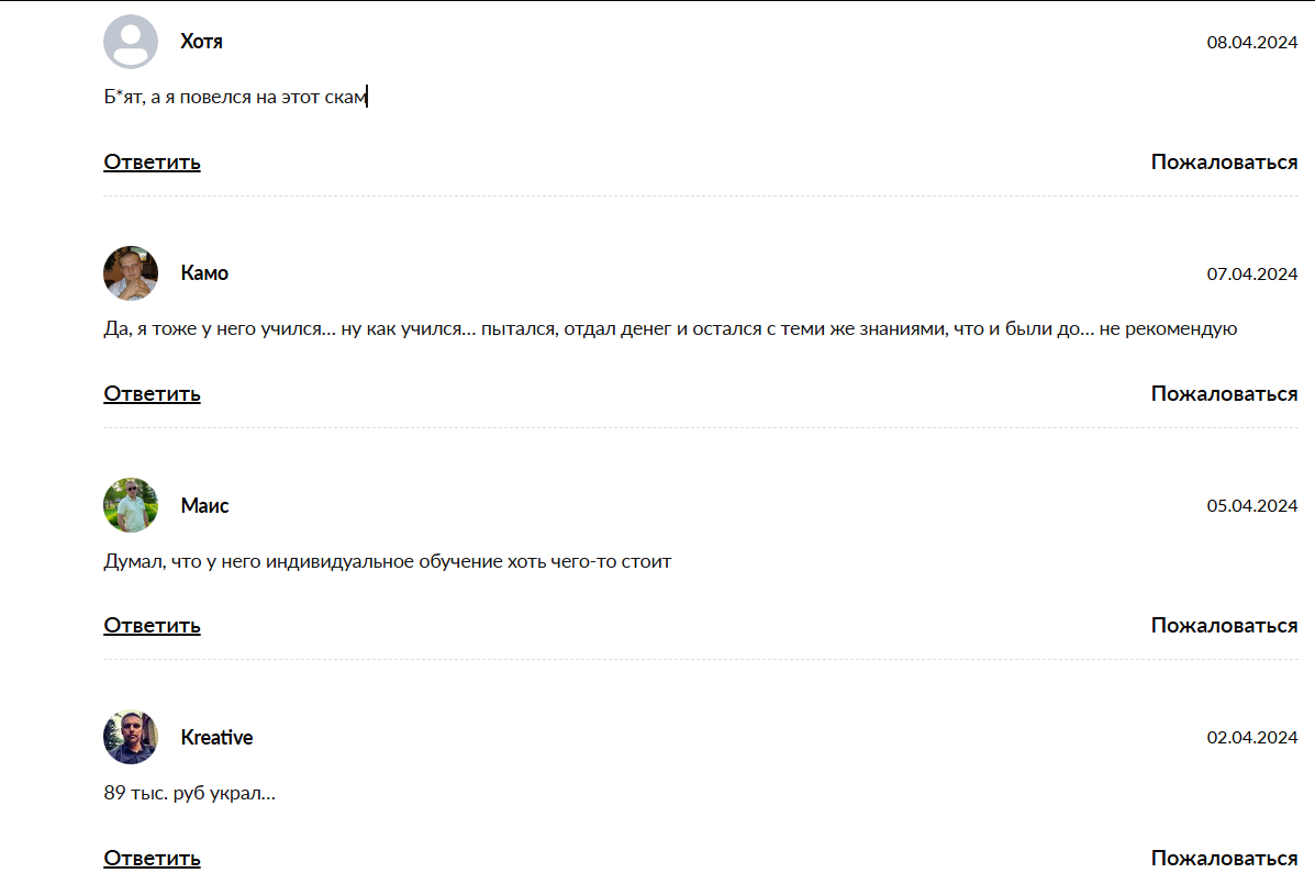 На своих ресурсах (сайтах) трейдер Армен Геворкян демонстрирует только положительные отзывы от учеников и участников приватных чатов с сигналами. На сторонних независимых сайтах не все так сладко, где-то хорошие отклики, но есть и сервисы, где выложены исключительно жалобы с обвинением в разводе, примеры:
