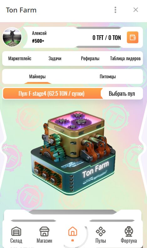 Бот в телеграме представляет собой P2E игру в системе ТОН, участники могут получать пассивный доход благодаря облачному фармингу, приобретению внутренних продуктов для увеличения мощностей, участию в общих пулах. После открытия приложения открывается весь функционал и возможности:
