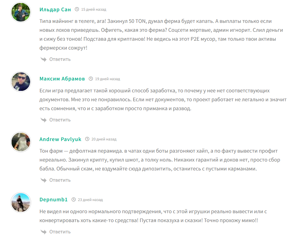 Отдельно отклики не публикуют, если изучить открытые чаты, то в сторону администрации негатива нет. Причем в случае сомнений у какого-либо подписчика, его сразу переубеждают, что все честно и без обмана, а выплаты поступают без перебоя. То есть, тут заранее подсажены боты. Для ознакомления с независимым мнением лучше просмотреть сторонние ресурсы. В статьях обычно предупреждают о возможном СКАМе и очередной пирамиде. Объективные отзывы о Ton Farm также написаны с негативным подтекстом, вот несколько примеров с жалобами: