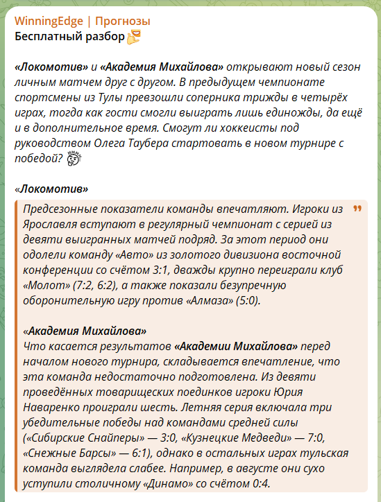 На канале TG WinningEdge бесплатные прогнозы на хоккей в большинстве случаев выходят в виде ординаров с коэффициентами выше 1.7. Ставки делаются на большие рынки (победы, форы, тоталы). Свои мысли каппер сопровождает небольшим обоснованием: