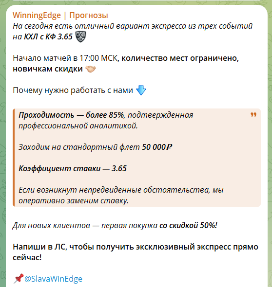 Почти каждый день от Славы (SlavaWinEdge) поступает предложение приобрести экспресс с коэффициентом выше 3.0:
