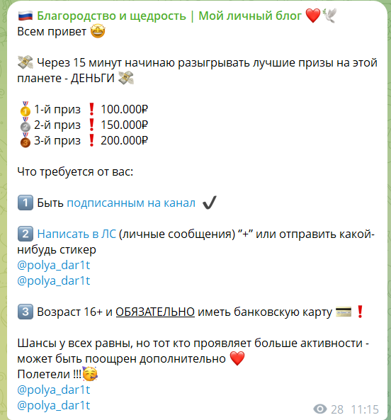 Благородство и щедрость – это телеграм-канал с розыгрышами денежных средств, которые проводит миллионер, бизнесмен и инвестор Полина (@polya_dar1t). По доброте душевной девушка решила раздавать часть заработанных средств обычным людям. При проверке было отмечено, что ресурс однозначно принадлежит мошеннице. Выиграть удастся, а вот получить приз, нет. По схеме развода у каждого «счастливчика» будут требовать деньги, а после заблокируют.