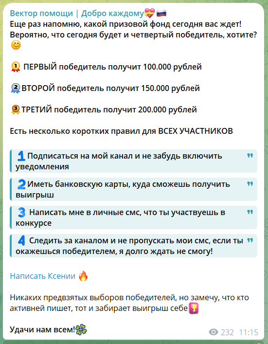Выигрывает каждый человек кто примет участие в розыгрыше на канале «Вектор помощи», но радости эти люди точно не испытают. Именно на этапе «выплаты» начинается главный акт финансового спектакля. Победителю сообщают «радостную весть», но тут же ставят условие: для получения денег необходимо совершить пробный платеж (обычно 1000–2000 рублей) со своих реквизитов. Ксения аргументирует это требованиями банковской системы «Антифрод».