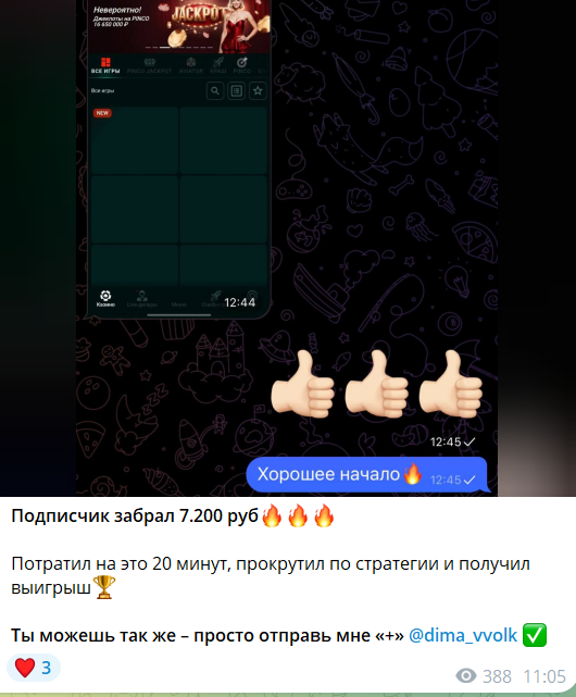 Проект Волков в деле посвящен беспроигрышным стратегиям игры в онлайн казино. В качестве главного на канале в телеграме выступает Дмитрий @dima_vvolk. Автор ведет собственную отчетность по клиентам и демонстрирует постоянно отзывы от них. При анализе отмечено, что ресурсом владеет мошенник. Да, игровые тактики действительно оказываются эффективными, только вывести деньги с платформы никто не даст, причем с каждого потребуют внесение дополнительных платежей.