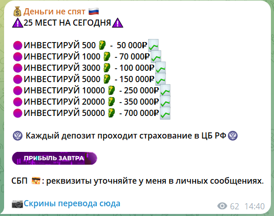 С 500 рублей обещают выплатить 50 тыс., с 50000 рублей – 700 тыс. В публикации идет уточнение, что вложения застрахованы ЦБ РФ, и это наглая ложь. Чтобы это стало возможным, компания должна вести законную банковскую (инвестиционную) деятельность, а в нашем случае организация даже не зарегистрирована. Причем деньги уходят на карты непонятных частных лиц.