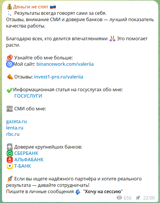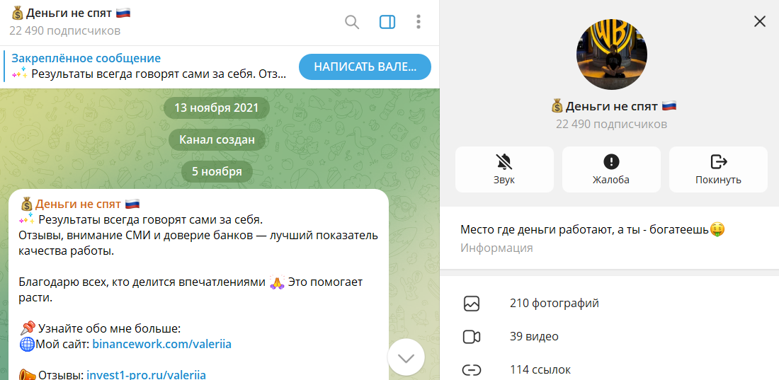 Все больше открывается инвестиционных сообществ с пассивными заработками на раскрутках депозитов. Условия сотрудничества могут быть разные, но такие ресурсы объединяет одно – все они принадлежат мошенникам. Канал в телеграмме «Деньги не спят» с увеличением депозитов на крипте не стал исключением. При анализе выяснилось, что трейдер и инвестор Валерия не делает даже разовых выплат. Данная особа принимает вклады, а потом начинает требовать повторные депозиты.