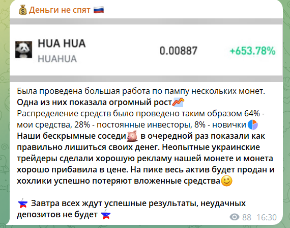 Публикация сопровождается небольшим комментарием, мол, была проведена большая работа по пампу и торговая сессия закрылась с хорошей прибылью. Даже если поверить в эти сказки, возникает вопрос, если по инвестициям выплачивают +10000%, а монета дала рост всего +600%, то откуда берутся остальные деньги??? Получается, этот благодетель платит с собственного кармана…