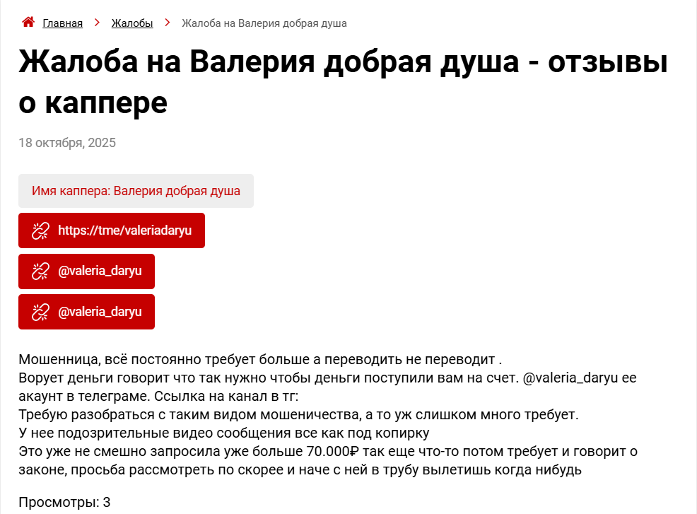 В телеграмме представлены текстовые и видео отзывы от инвесторов, которые прибывают в диком восторге от пассивных заработков. Важно! Фейковые ролики покупаются на биржах, а реальную информацию о проекте можно найти на многих сторонних сайтах. Смысл в том, что Валерия ведет сразу сетку каналов клонов, а жалобы можно найти даже на нашем верификаторе по проверке: