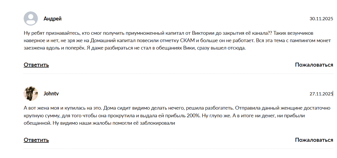 На канале «Домашний капитал | Доход, не выходя из дома» в телеграме продемонстрированы только хорошие комментарии. В переписках и видеообращениях вкладчики в отзывах подтверждают, что выплаты реально есть. Не стоит верить в фейковые сообщения, которые покупаются на биржах фриланса. Независимое и объективное мнение о мошенническом блоге представлено на многих сторонних сайтах. Под обзорами с обвинением в разводе в 100% случаев оставлены жалобы: