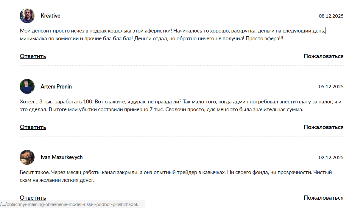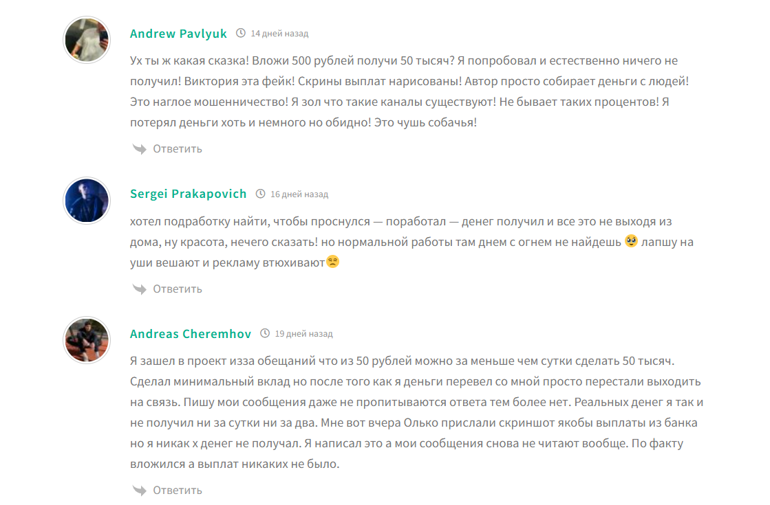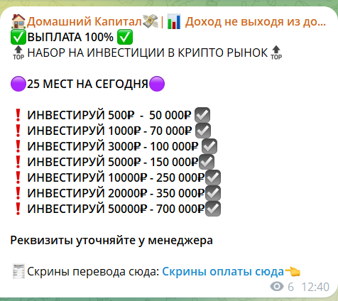 От сомнительного блога в мессенджере лучше сразу отписаться, здесь используется довольно банальная и распространенная схема обмана, которая включает в себя несколько ступеней. Сначала псевдо инвесторы выманивают минимальную сумму в размере 500-1000 рублей, а далее начинают поступать бесконечные требования по внесению повторных платежей. Придуманные поводы могут отличаться: налоги, брокерская комиссия, услуги гаранта, верификация и т.д. Как только денежный поток прервется, все вкладчики окажутся заблокированными.