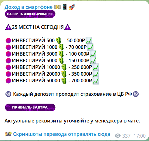 Многие могут подумать, мол, 500 рублей потерять не жалко – на это и рассчитывают мошенники, которые являются дополнительно хорошими психологами. В срок выплаты каждый инвестор получит уведомление с поздравлениями, что раскрутка завершилась удачно и все готово на выплату, правда, с суммы дохода вначале нужно перевести 13% для уплаты налогов, далее появятся услуги гаранта, которому надо еще 10%. Требования в дополнительных переводах могут поступать бесконечно, но по итогу ничего не выплатят.