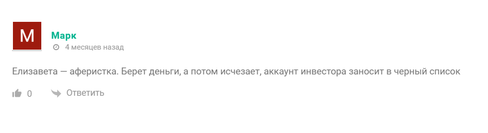 Как и положено всем инвесторам мошенникам, Елизавета активно прикрывается положительными видеоотзывами и текстовыми переписками с вкладчиками. Подобный фейк не представляет никакой ценности. В сети огромное количество жалоб, на нашем сайте верификаторе есть жалоба: где обманутые вкладчики подробно рассказывают о схеме развода. Под обзорами о других ее каналах также собрались негативные комментарии с обвинением в мошенничестве, примеры: