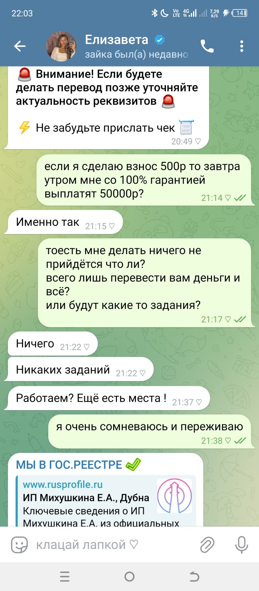 Мы рассмотрели проект, где используется распространенная схема развода, сначала у мошенников стоит задача получить минимальный депозит, ну а далее пробуют получить с доверчивого человека более крупную сумму, поводы разные: нужно уплатить налоги, гаранта, верификацию и т.д. Если вас обманула Елизавета Трейд (Трейдинг) @ElizavetaTrade, напишите отзыв в комментариях!
