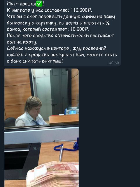 На ресурсе мошенники используют распространенную схему обмана. Реальных ставок даже делать никто не собирался. После первого перевода будут просить еще – якобы купон сыграл, но БК попросила уплатить 13% налога с выигрыша. Если человек поведется и переведет еще, то объявится гарант для совершения безопасной сделки, которому так же нужно заплатить 10% с вывода. В конце все без исключения инвесторы блокируются и удаляются.