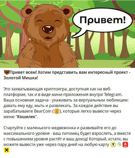 Проект Золотой Мишка (@beartokengamebot) представляет собой тапалку, где пользователям предложен заработок на кликах. Вывод денежных средств возможен при достижении определенной суммы на балансе. Проверка показала, что приложение в телеграме однозначно принадлежит мошенникам, так как при оформлении выплаты с каждого игрока начнут требовать бесконечные платежи, но вывести так ничего и не дадут. Мнение команды KAPER.PRO подтверждается многочисленные отрицательными отзывами на сторонних сайтах под обзорами с обвинением в разводе. Самые доверчивые люди потерли огромные деньги!