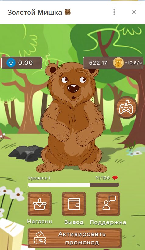 После запуска приложения открывается весь функционал. На главном экране представлен баланс кристаллов и BearCoin (к криптовалюте токен не имеет никакого отношения). Для заработка в тапалке Золотой Мишка необходимо кликать по телу питомца. Доход зависит от полученного уровня (чем выше, тем больше).