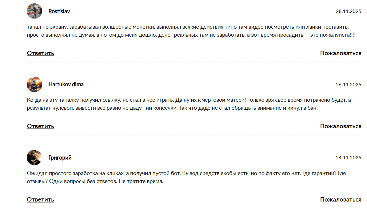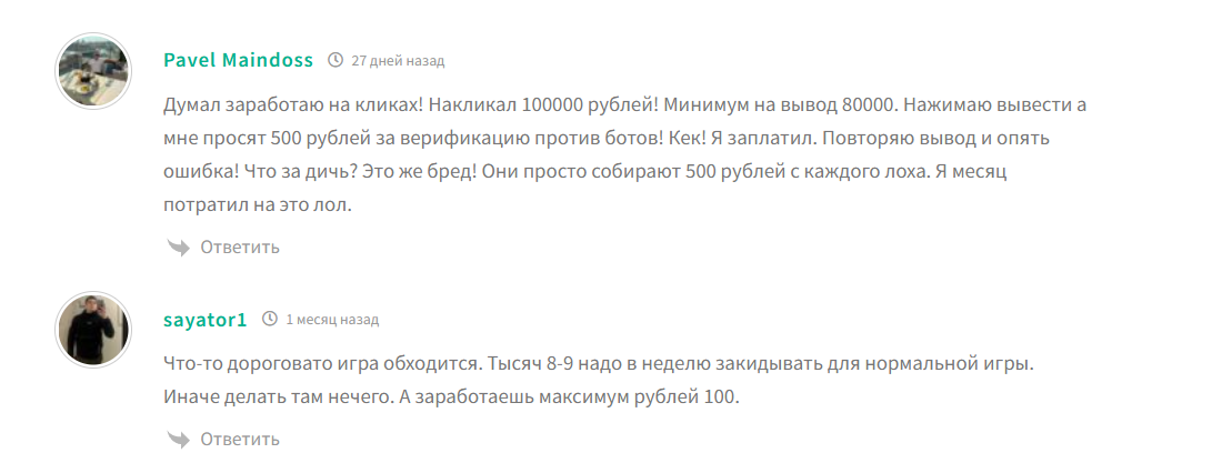 Подобные порталы представляют огромную угрозу для подписчиков. В лучшем случае человек тратит бессмысленно свое время, в худшем – несет финансовые потери. Смысл в том, что на кристаллах мошенники никогда не остановятся. Далее придется платить за верификацию, комиссию и т.д., все зависит от фантазии нечестных разработчиков СКАМ тапалки. Деньги вывести не дадут, и это факт!