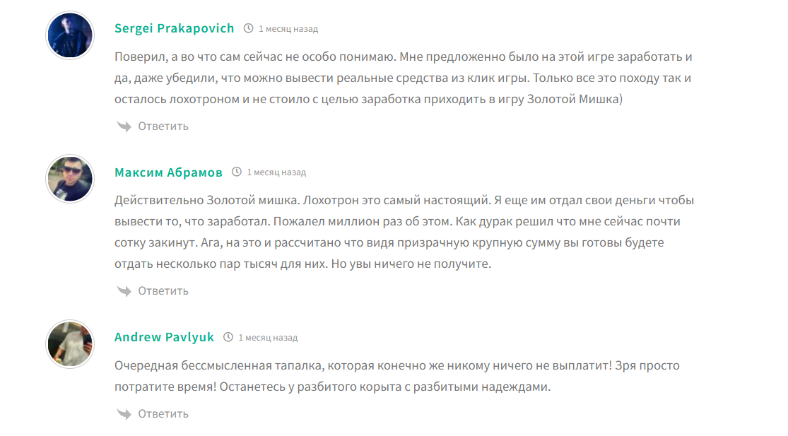 Если в приложении открыть раздел «Вывод», то можно увидеть ники игроков и суммы с выплатами, но такие доказательства не имеют ценности, ведь нарисовать можно все что угодно. Более правдивая информация о тапалке ТГ Золотой Мишка @beartokengamebot представлена на многих сторонних независимых сайтах, где такой заработок на кликах называют фейком. Проект везде внесен в черные списки, причем под опубликованными статьями с низким рейтингом только негативные отзывы. Обманутые люди делятся, кого и насколько развели:
