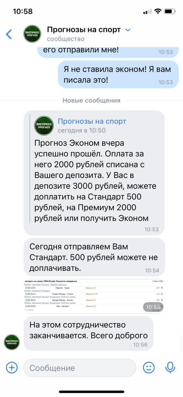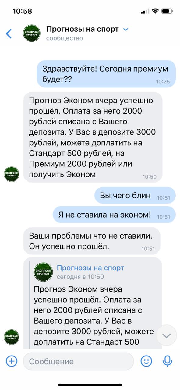 Илья Макеев так называемый директор аналитического центра «прогнозы на спорт» группа вконтакте, продаёт 3 экспресса «эконом» «стандарт» «премиум» я перевёл 5000 за премиум, в итоге получил эконом, который не прошёл, но он требует в случае прохода платить и эконом, обещает на следующий день прислать премиум, и снова присылает эконом, это бесконечная рулетка пока эконом не зайдёт и вы его не оплатите, не ведитесь люди!!! Илья Макеев и его группа мошенники!!!
