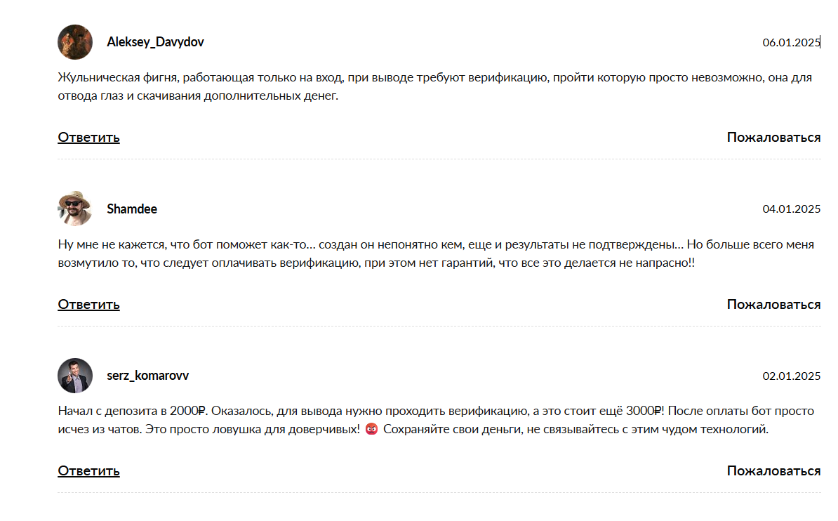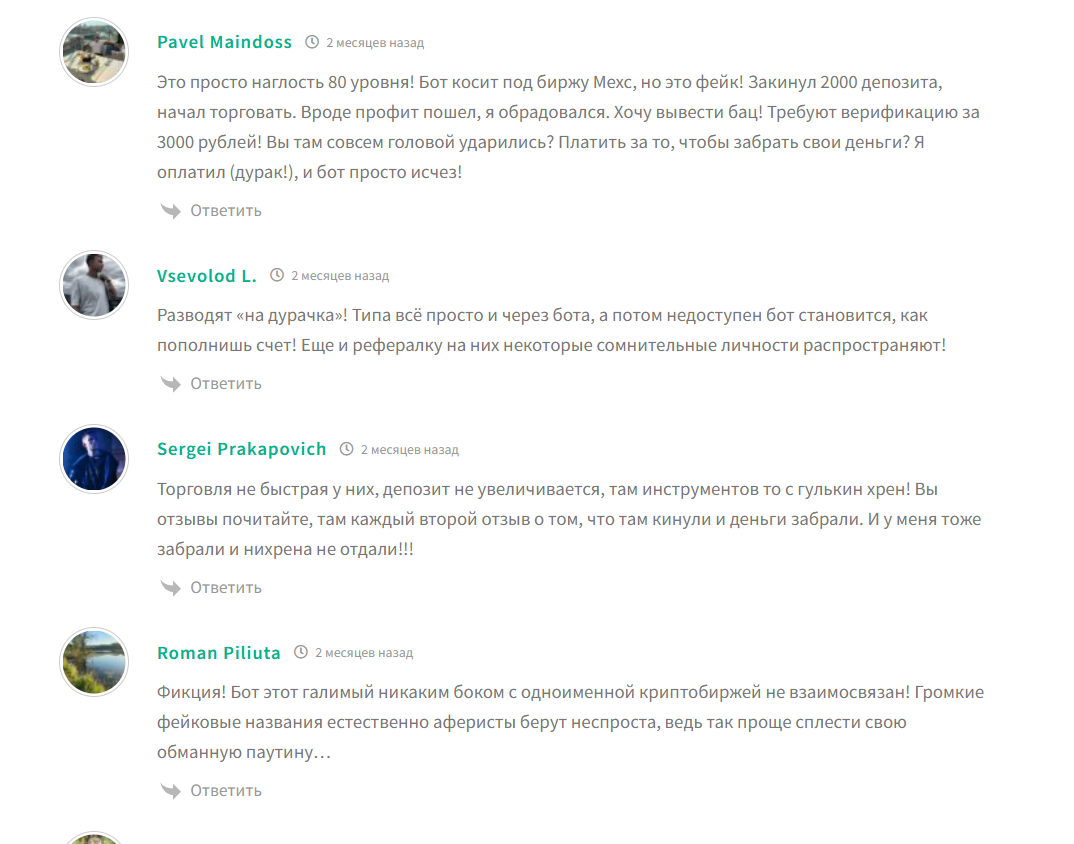Представители сервиса о себе отзывами игроков рынка не делятся. Для получения независимой оценки рекомендуем воспользоваться независимыми источниками. В обзорах отмечают, что бот не имеет отношения к бирже и принадлежит мошенникам. В открытых комментариях пользователи полностью подтверждают наше мнение, а именно – вывести деньги невозможно: