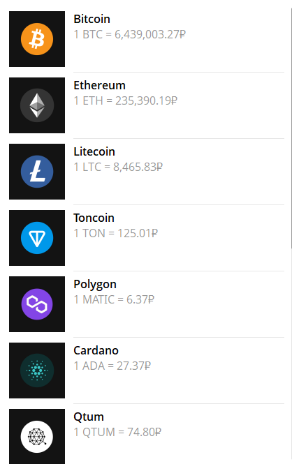 Ввод и вывод денежных средств возможен на карту, через систему быстрых платежей, криптокошелек. На бирже в списке криптовалют доступны следующие монеты: