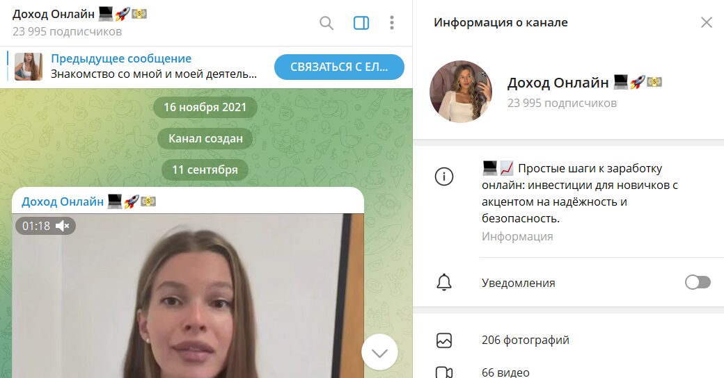 Девушка ведет канал в телеграме Доход ОНЛАЙН, который был основан 16 ноября 2021. Работа с аудиторией началась не сразу, а только с 11 сентября 2025 (менее 1 месяца назад). В короткий срок в группе оказалось 24 тыс. подписчиков, однозначно проводили накрутку, так как выложенные публикации за сутки набирают максимум по 20-40 просмотров (живых не более 4%). Комментарии предусмотрительно закрыты.