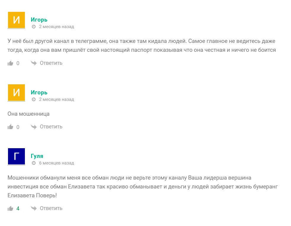 Сегодня в нашем обзоре довольно популярная личность в телеграмме Михушкиниа Елизавета Алексеевна, которая ведет сетку каналов Доход ОНЛАЙН и др. Девушка позиционирует себя успешным трейдером по рынку криптовалют, но на деле является очередным мошенником в социальных сетях. Даже на нашем сайте десятки негативных отзывов и жалоб от кинутых людей, которые называют ее различными словами: обманщица, разводила и т.д. Смысл в том, что выплат по вкладам нет, а каждого инвестора пробуют обмануть несколько раз.