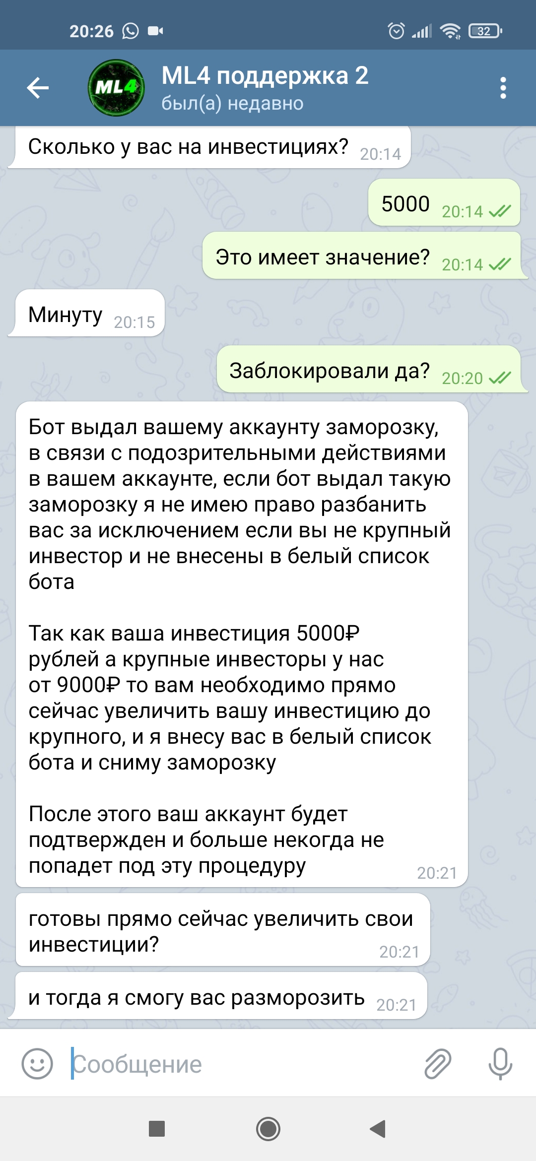 При проверке наши эксперты выяснили, что вкладчикам обещают 4% в день (120% в месяц или 1460% в год). С уверенностью можем сказать, что все, кто гарантирует такую прибыль (и неважно, в каком направлении работают), являются мошенниками. В нашем случае мы увидели обычную пирамиду, где мелкие суммы выплачивают, а при более крупном переводе сразу все транзакции блокируются – люди остаются без денег. Если был опыт инвестиций в бота робота ML4 @MelegenRobot в телеграме, обязательно напишите отзыв, это усложнит работу сомнительному проекту и предостережет других пользователей.