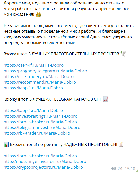 Наша Маша уверяет, что входит в ТОП 5 благотворительных проектов и лучших каналов в телеграмме, а также в ТОП-3 надежных порталов. В качестве подтверждений своих слов приложены ссылки на сайты. И тут есть важный нюанс – все заявленные ресурсы СКАМ, где-то в доменном имени измена буква, где-то вообще странички переходники, есть и сервисы, где во всех разделах информация только о группе «От сердца к сердцу». В общем, верить всему не стоит!