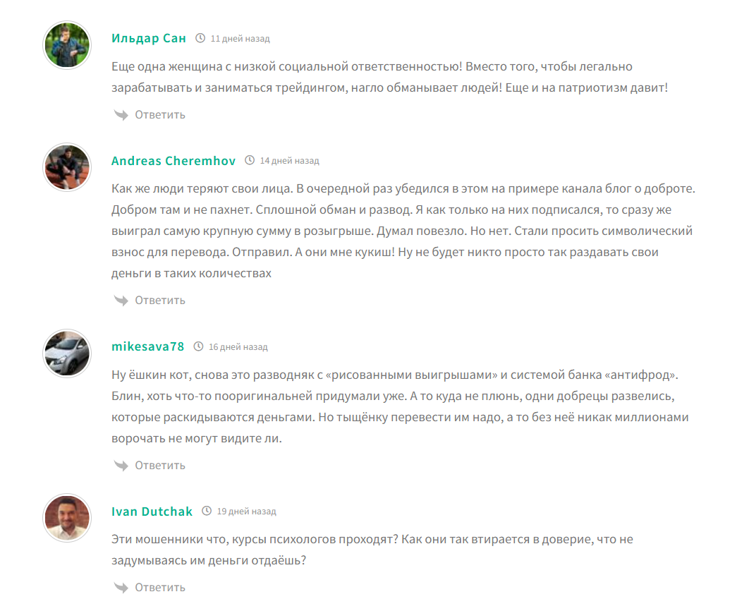 В опубликованных переписках на ресурсе победители благодарят девушку и прибывают в восторге от «свалившихся денег». Важно понимать, что подобные комментарии легко написать самому с двух профилей. Для ознакомления с независимой оценкой лучше воспользоваться сторонними источниками. В статьях описывают подробно способ мошенничества, а под публикациями практически на всех сайтах выложены многочисленные жалобы от кинутых победителей: