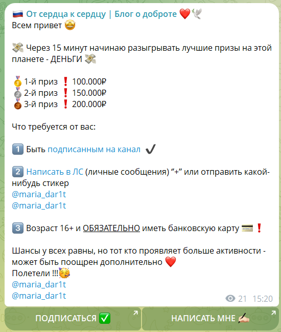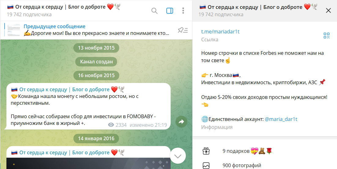 Проект «От сердца к сердцу» принадлежит бизнесмену Марии (@maria_dar1t) и посвящен денежным конкурсам. На канале в телеграмме аудитории просто так раздают деньги. По легенде девушка помогает нуждающимся людям. На деле мошенница выманивает с победителей деньги (все предлоги вымышленные), а после прерывания денежного потока всех блокирует и удаляет переписку.